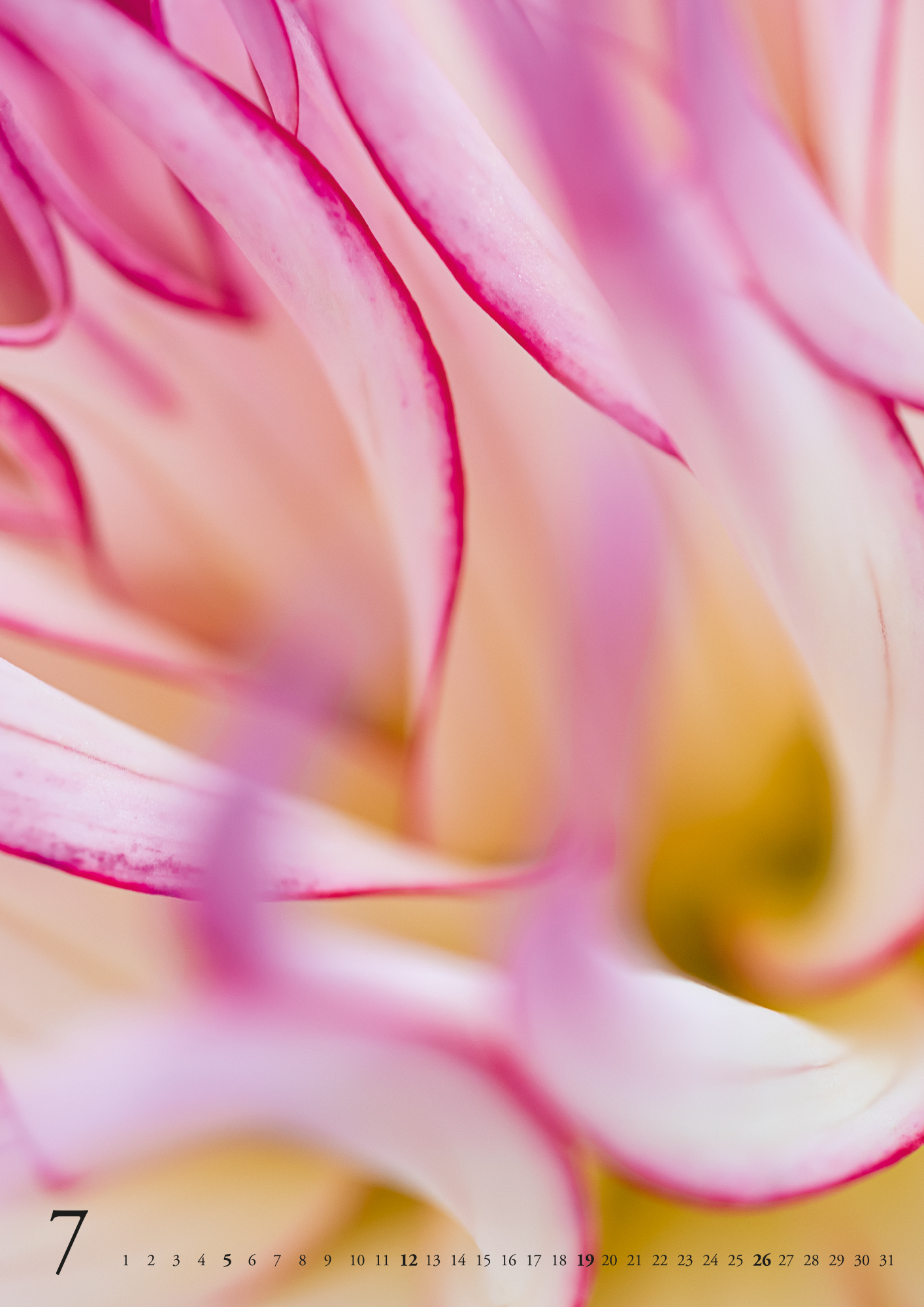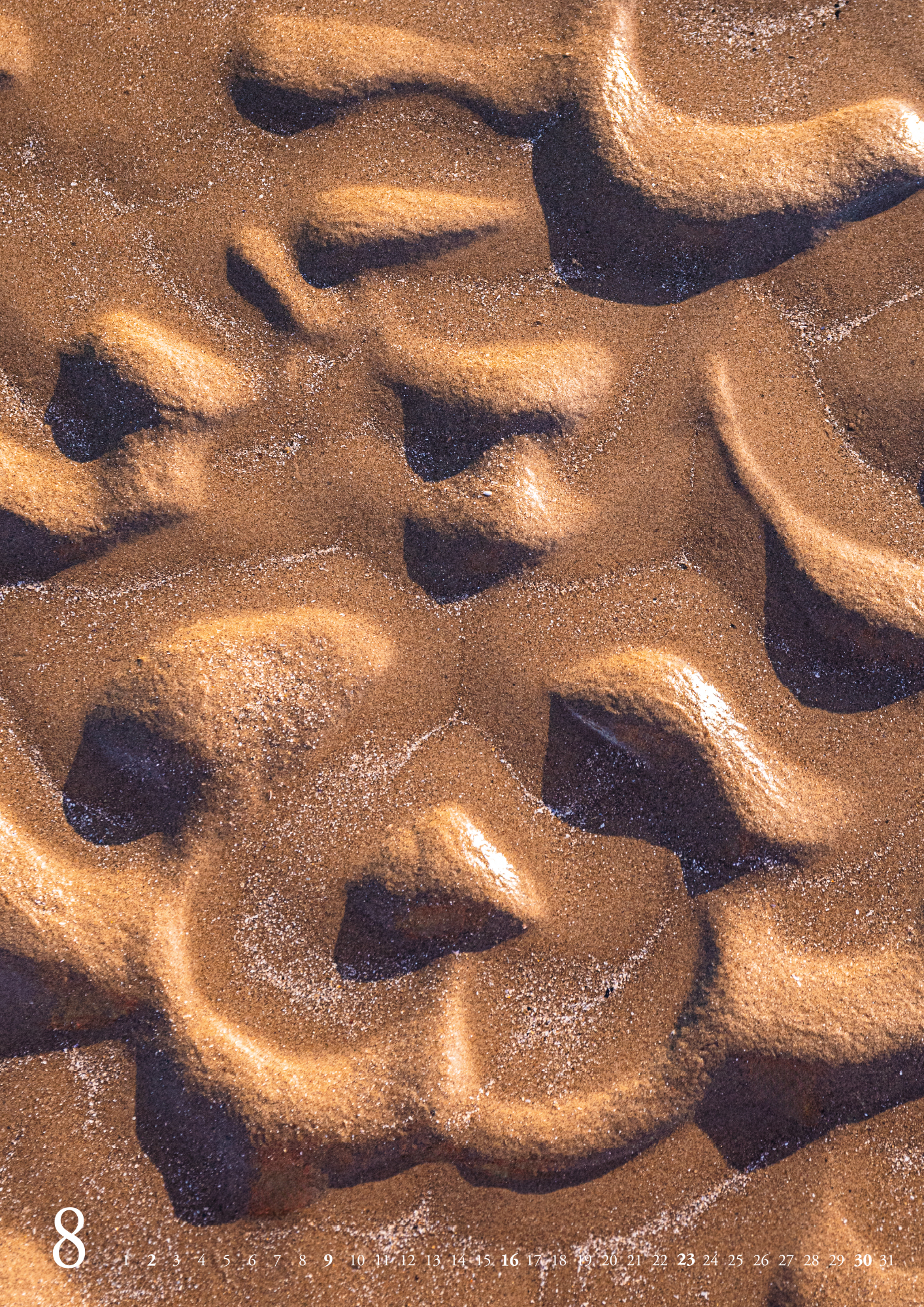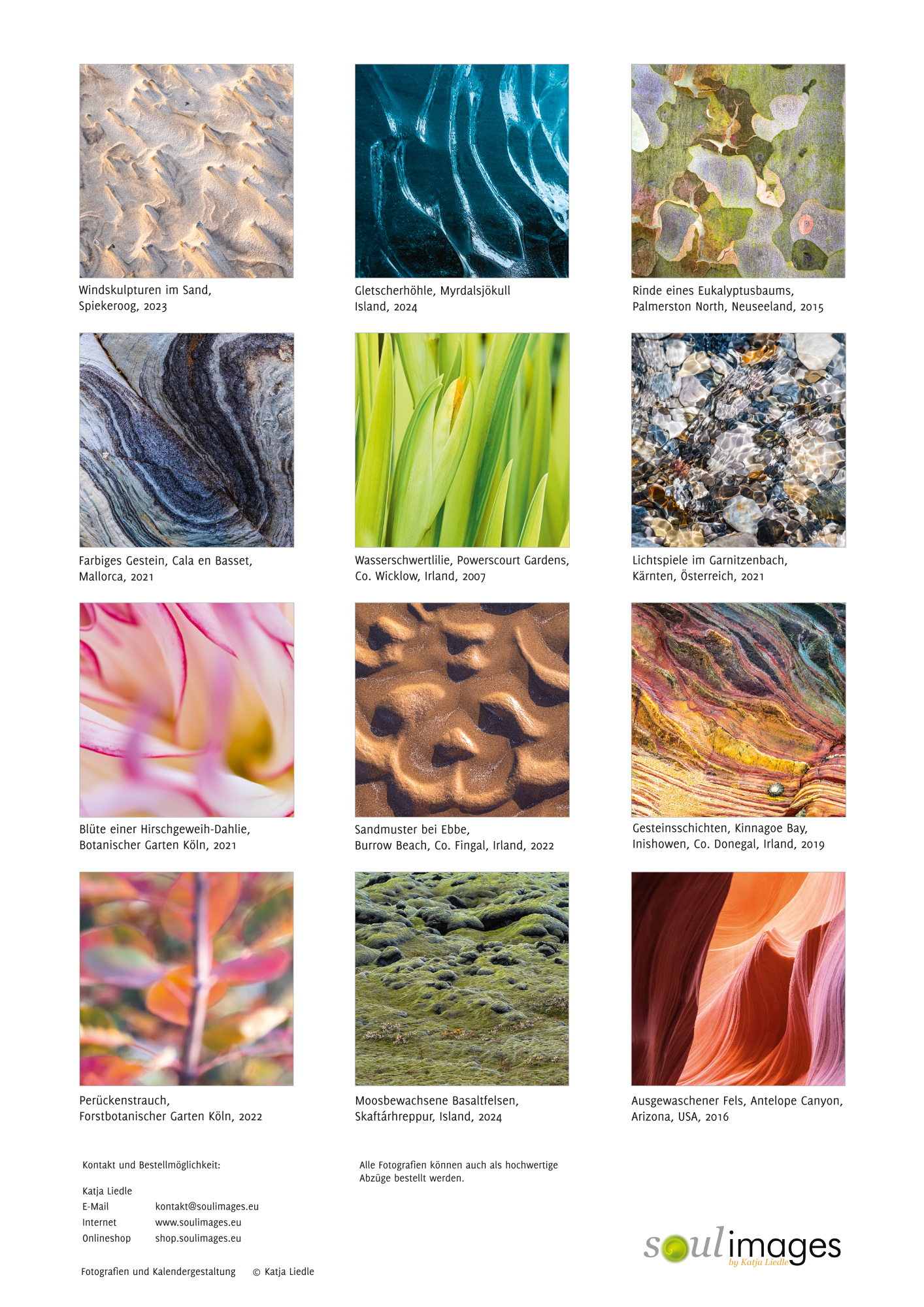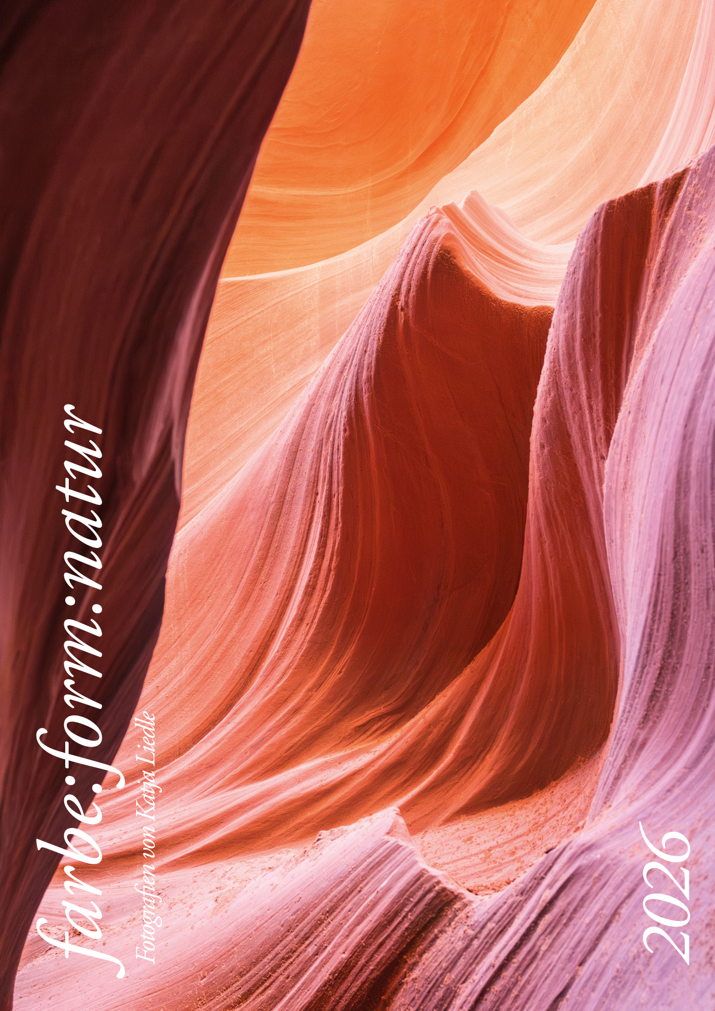 Der neue Kalender für 2026 ist da! Auch in diesem Jahr gibt es wieder ungewöhnliche Nahansichten der Natur, von den berückenden Kurven des Antelope Canyon in Arizona zu den immer wieder faszinierenden Details einer Dahlienblüte, von vom Wind erschaffenen intimen Landschaften am Strand von Spiekeroog zu den Lichtmustern in einem Kärtner Bergbach, über die ungewöhnlich farbige Rinde eines Eukalyptusbaums zu den Besonderheiten der isländischen Landschaft: samtige Mooskissen in den Weiten der vulkanischen Landschaft und beeindruckenden blau schimmernden Wänden einer Gletscherhöhle. Ein guter Grund, sich jeden Monat auf das neue Kalenderblatt zu freuen. Für mich ist der Kalender jedes Jahr neu eine Feier der Schönheit und der Kräfte der Natur, eine optisch spannende und abwechslungsreiche Begleitung durchs Jahr.